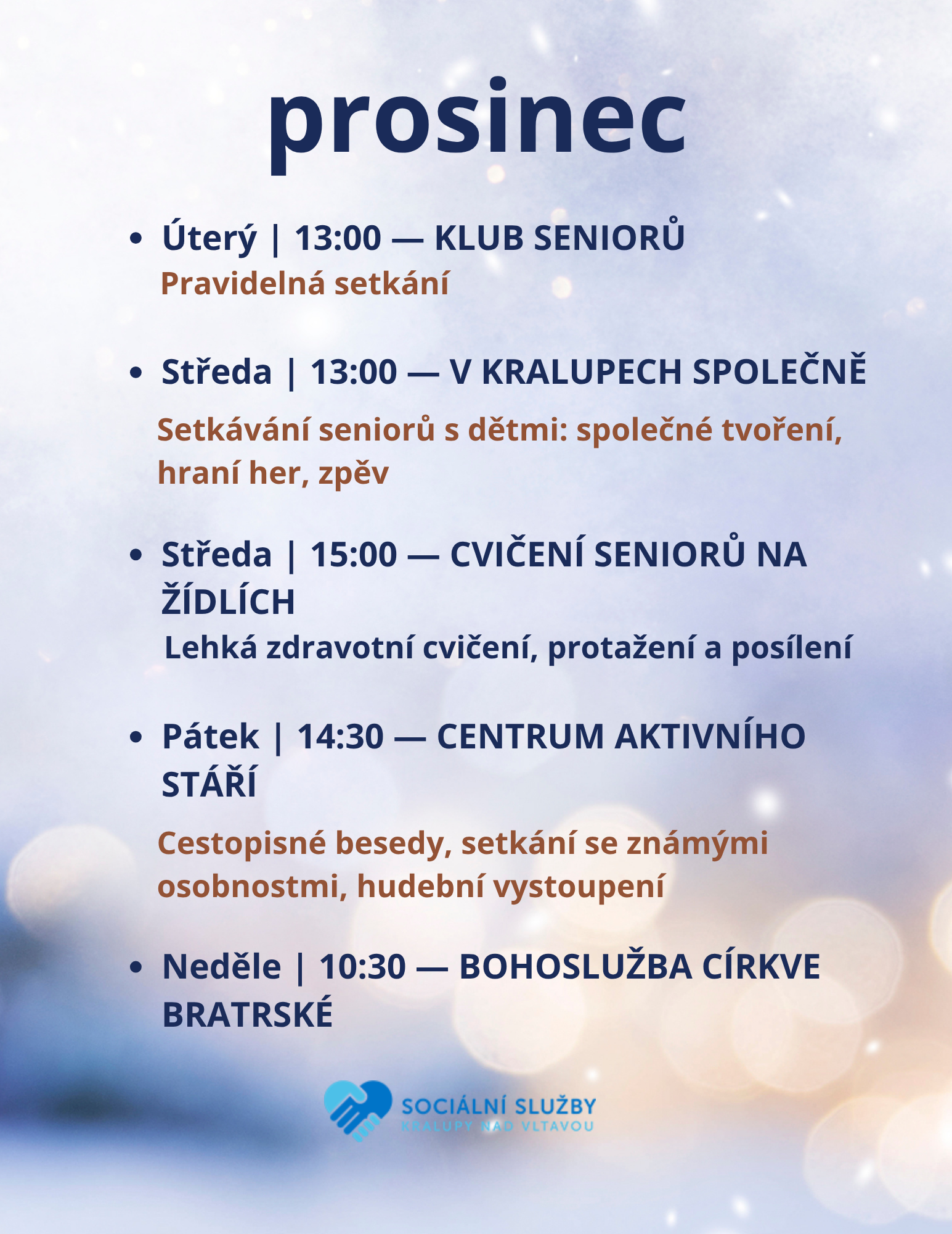 Prosinec přináší nový měsíc plný setkávání, tvoření a inspirace! 🎄 Přijďte si s námi užít předvánoční atmosféru, zapojit se do tvořivých dílen, rozhýbat tělo a načerpat energii na besedách plných zajímavých témat. Podívejte se, co vás v prosincovém programu čeká! ✨