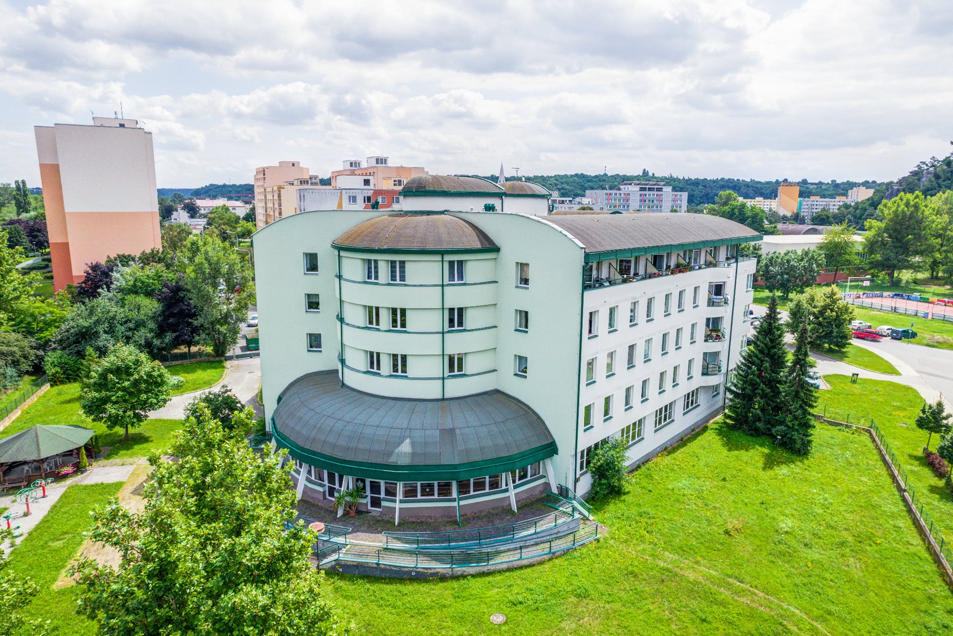 Tento dům vybudovaný v 90. letech 20. stol. čeká na rekonstrukci atria. Město Kralupy nad Vltavou již zadalo projekční práce. Rekonstrukce atria bude spočívat v novém opláštění (zateplení) vnitřní části budovy, budou změněny dispozice oken. Cílem je maximálně snížit energetickou náročnost budovy a vyměnit již nevyhovující okna. Výměna oken a zateplení budovy z vnější části bylo započato v lednu 2025. V domě se nachází vrátnice, která je funkční od pondělí do neděle v čase 7:00 - 19:00 hodin. Dále zde nalezneme prostornou polokruhovou jídelnu s impozantním stropem. Z ní je pěkný výhled na zahradu, která je dějištěm různých akcí a místem setkávání členů různých klubů (např. Klub seniorů, projekt V Kralupech společně, Centrum aktivního stáří, atd.) Na zahradě mohou naši klienti využít krytý altánek vhodný k posezení a také venkovní posilovnu. V budově se nachází prádelna a sušárna pro klienty, pedikúra, mají zde zázemí sestry ČK a v roce 2025 zde přibydou služby fyzioterapeutky a kosmetičky.