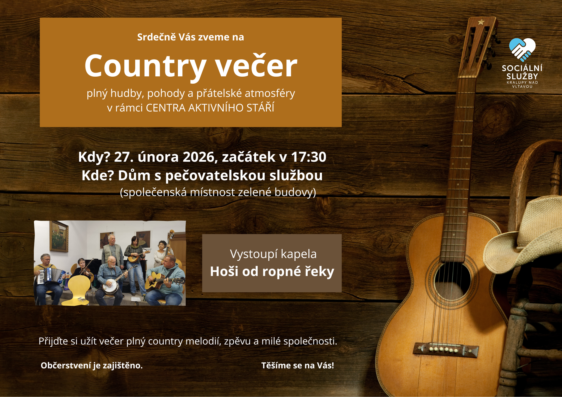 Srdečně Vás zveme na příjemný večer plný country hudby, pohody a přátelské atmosféry.