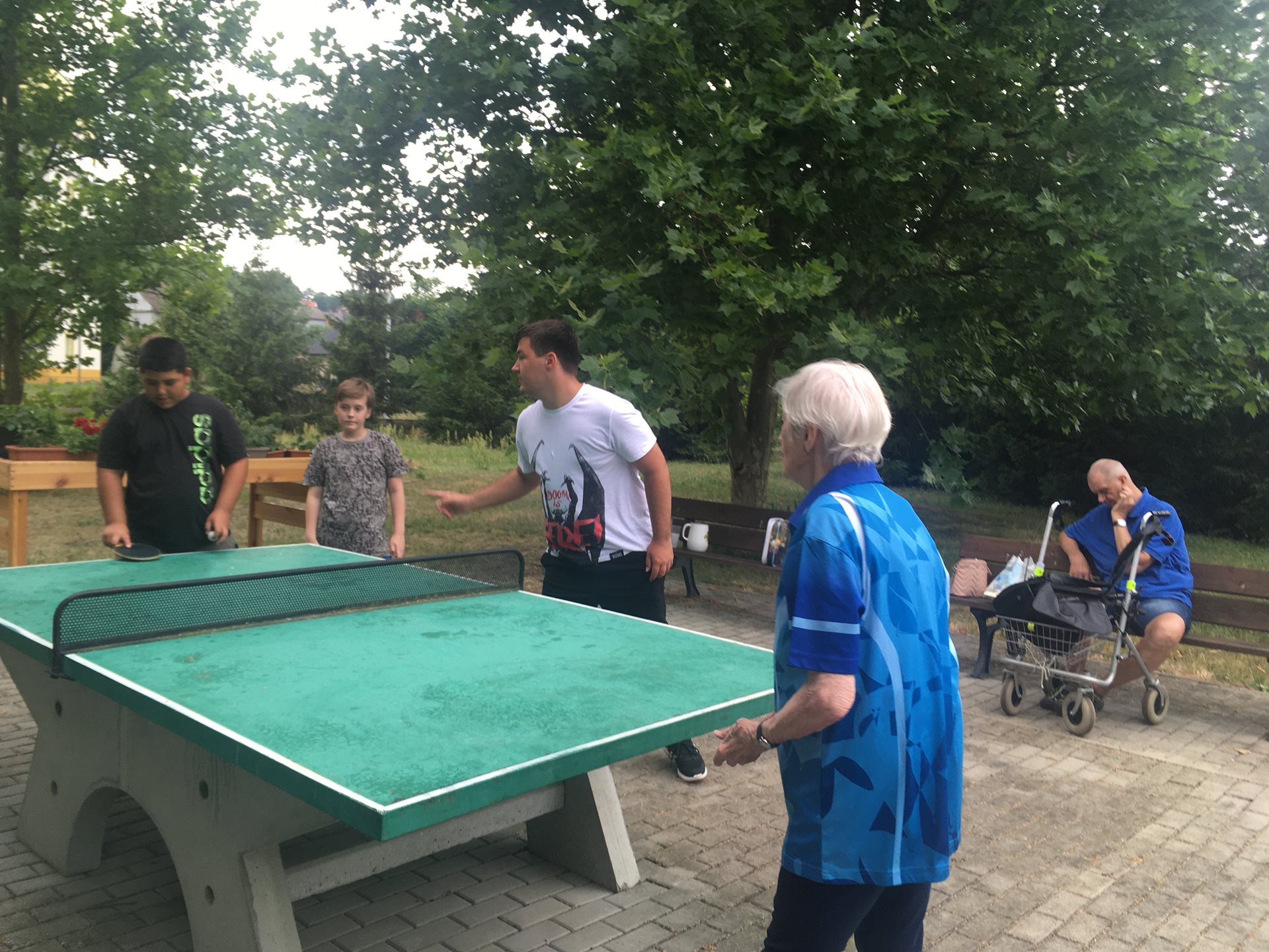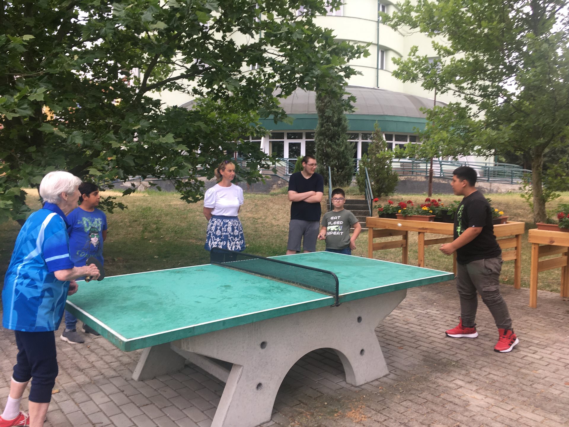20. června zahrada opět ožila. Děti ze ZŠ Jodlova přišly na domluvený přátelský turnaj v ping pongu. Setkali jsme s paní Eliškou Krejčovou, která je opravdu obdivuhodný sportovec. Děti asi trochu překvapilo, že je možné udržovat si takovou formu, jakou má paní Eliška a chovaly se opravdu pěkně.